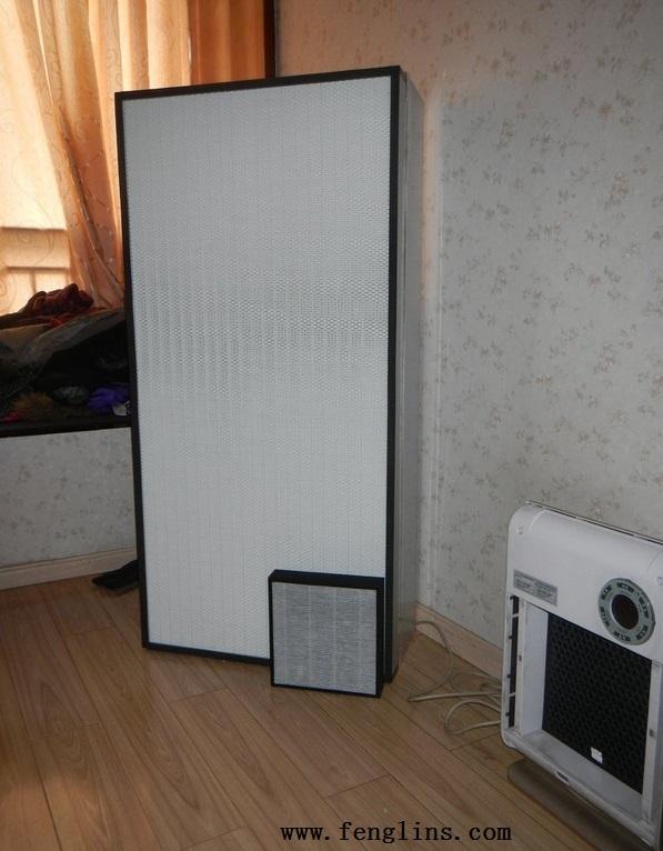 看看圖片,過濾板大小的對比效果。大白板是FFU的HEPA過濾板,角上那個是普通凈化器的過濾板。